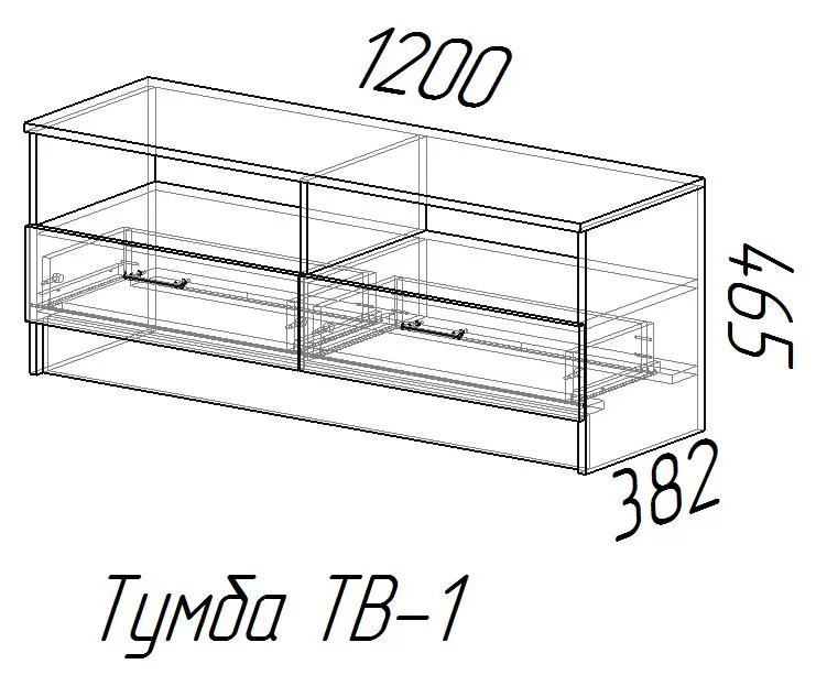 Тумба TV 1 – это элегантная конструкция для телевизора. Полка изготовлена из ЛДСП и имеет следующие параметры: высота – 465 мм, глубина – 362 мм, ширина – 1200 мм. Тумба разделена на 4 части. Верхние представляют собой открытые полки для декора. Нижние отделы – это выдвижные ящики, в них вы можете хранить любые принадлежности для TV, документы, фотографии и т.д.