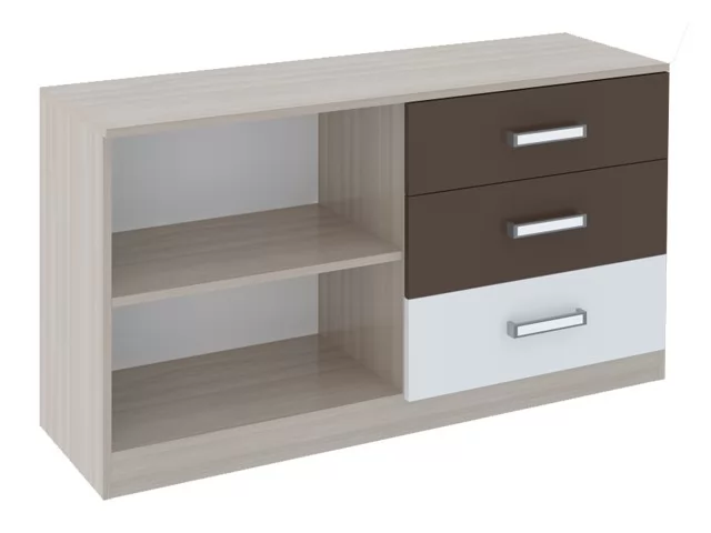 2. Тумба имеет открытую секцию и 3 выдвижных ящика.
