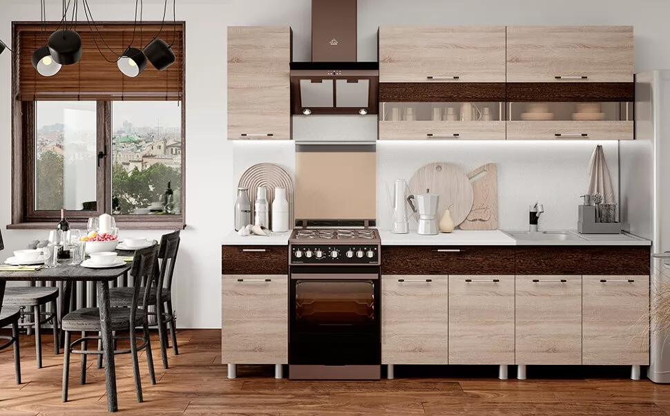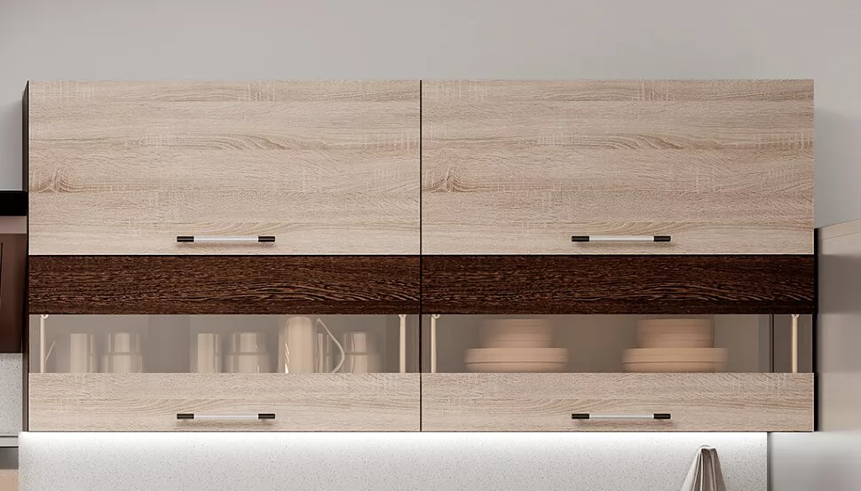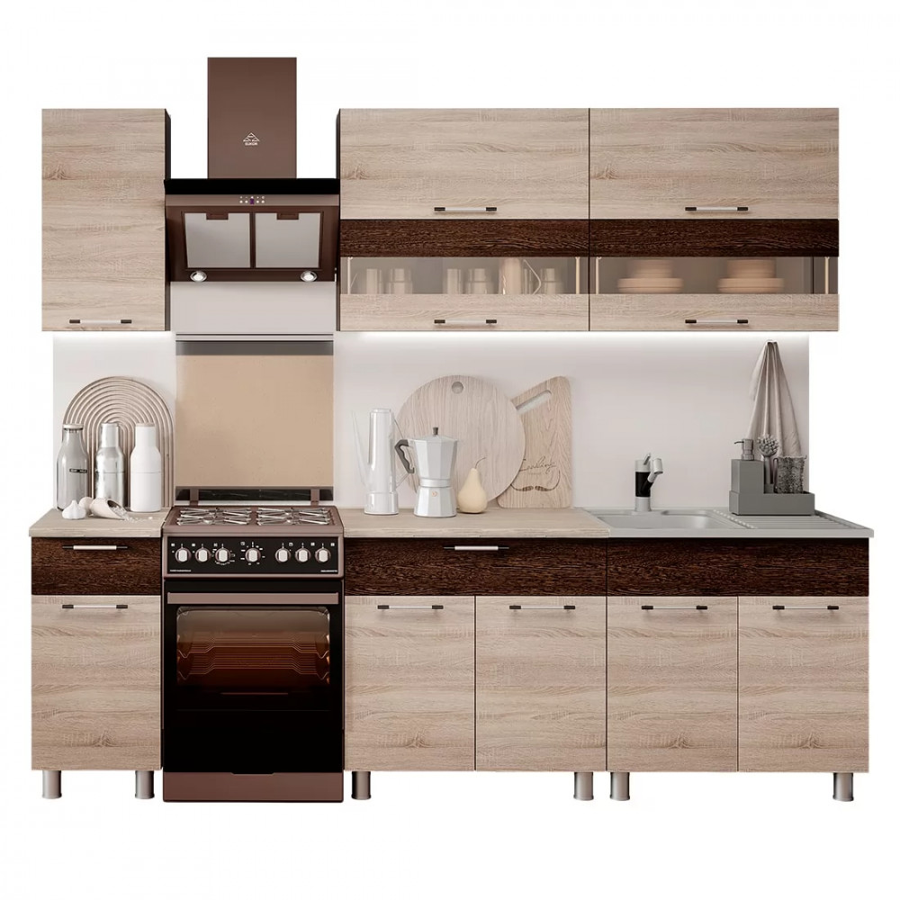 Кухня «Монтана» 2,0 м - это контрастное сочетание цветов, современный дизайн, функциональность и высокое качество материалов. Корпус: ЛДСП Венге. Фасад: ЛДСП венге / дуб сонома. Состоит из верхних модулей 4В1, 8В3, 8В3 и нижних модулей 4Р5, 8Р5, 8М2. В стоимость входит раздельная столешница «Тростник» 400+800 мм толщиной 26 мм.