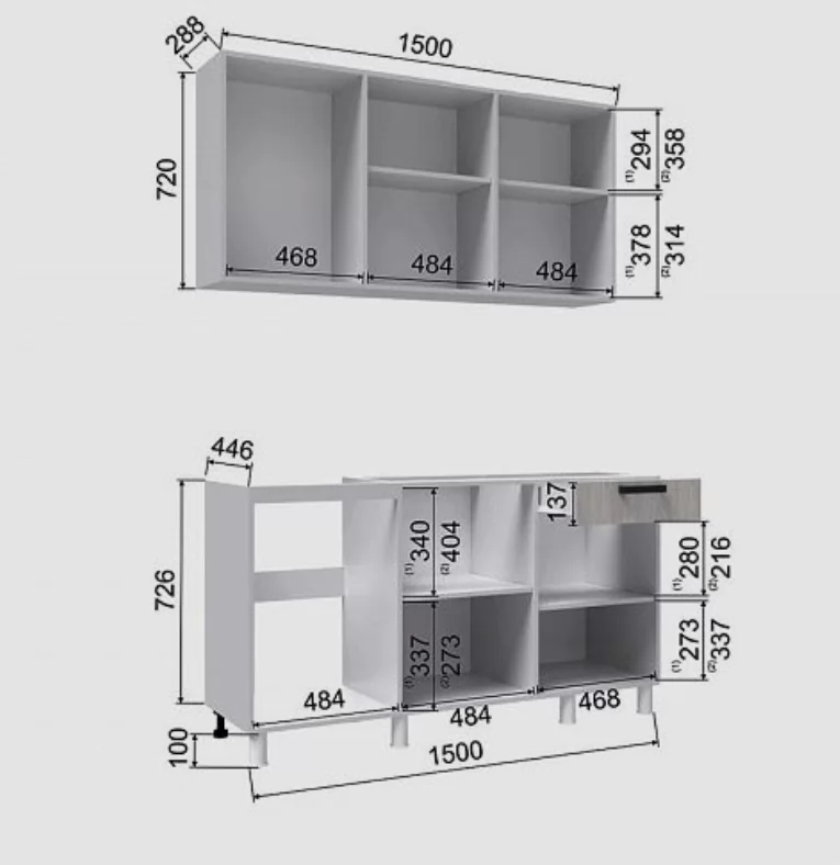 Высота верхних шкафов, мм: 720