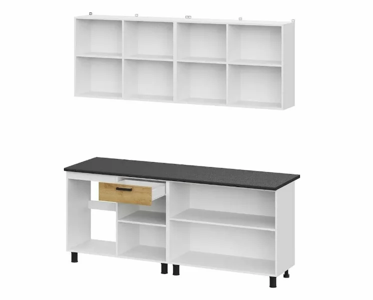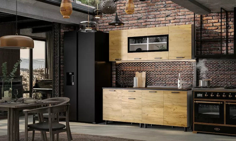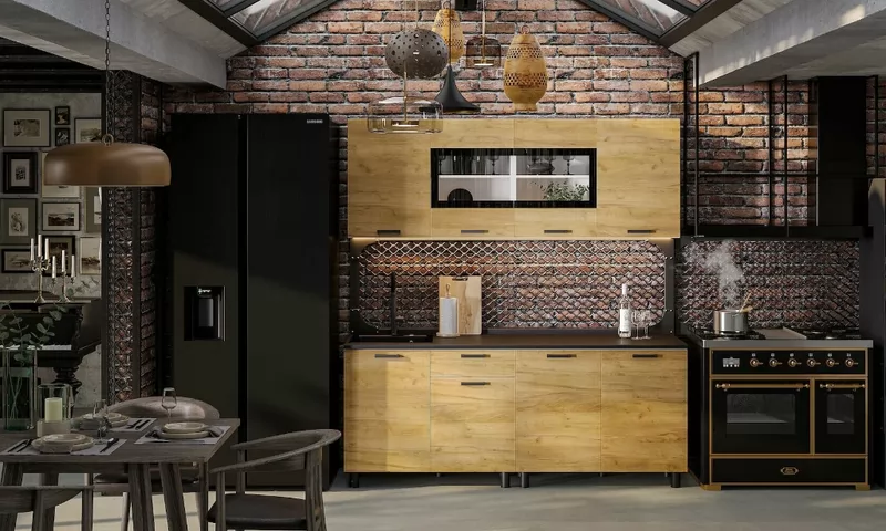 Древесный рисунок представлен в теплых золотистых тонах с вкраплениями, а сходство с натуральным деревом усилено текстурой покрытия. Материал имеет повышенную плотность, предотвращающую появление сколов: благодаря жесткой конструкции Вы сможете в случае необходимости собрать и разобрать гарнитур несколько раз. В кухонный комплект входит столешница из ДСП толщиной 26 мм, покрытая черным слоистым пластиком в черном цвете. Фасад верхнего шкафа украшен прозрачным стеклом обработанное еврокромкой для максимальной безопасности в процессе эксплуатации. Нижний модуль кухни укомплектован декоративными передними и задними черными опорами, регулируемыми по высоте и сглаживающими неровности пола.