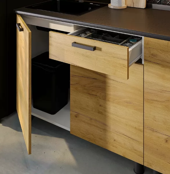 - Нижние модули с выкатным ящиком на роликовых направляющих, отсеками с полками и дверцами и отсеком под мойку с распашной створкой