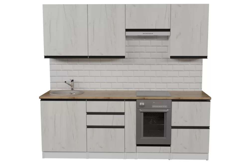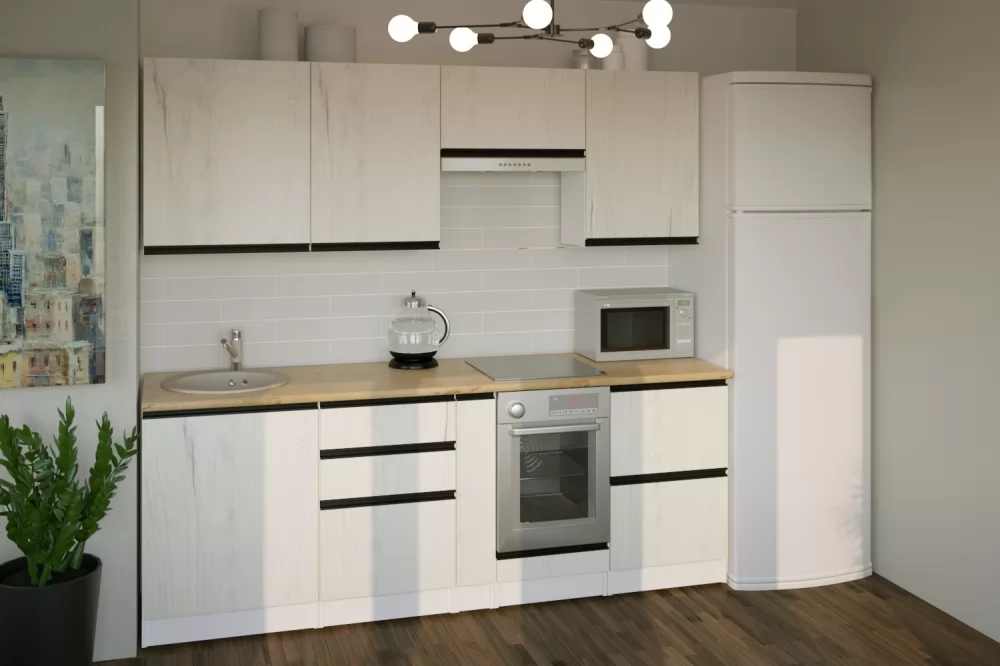 Прямые готовые кухни рациональны для маленьких квартир. При прямой планировке кухни важно предусмотреть место для холодильника и учесть его габариты. Если ваша кухня объединена с гостиной, или же настолько просторная, что позволяет сделать полноценную обеденную зону для большой семьи, то смело выбирайте линейную конфигурацию кухни.