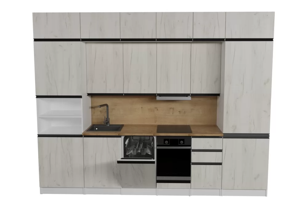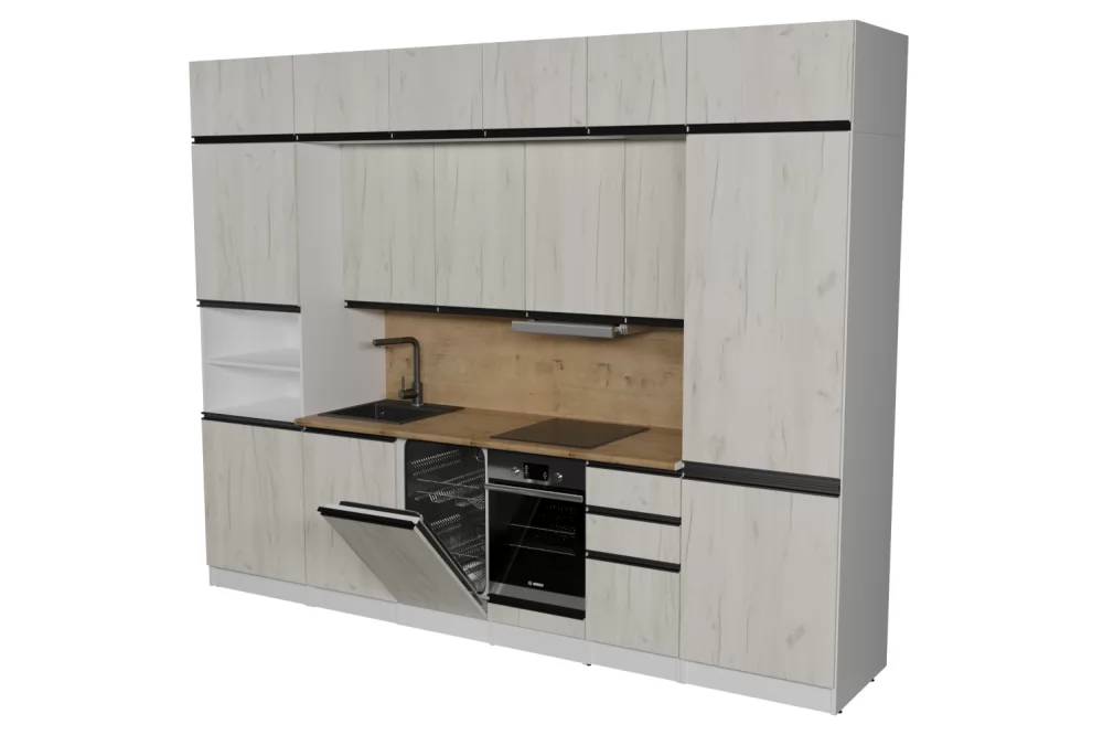 Мойки, смесители и посудосушители в комплекты гарнитуров не входят.