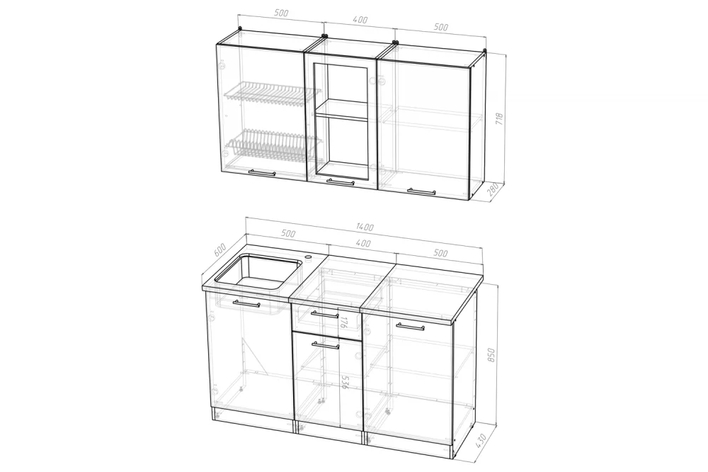 Мойки, смесители и посудосушители в комплекты гарнитуров не входят.