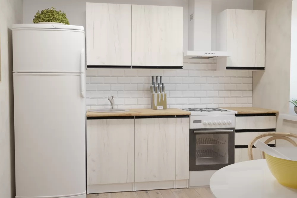 Прямые готовые кухни рациональны для маленьких квартир. При прямой планировке кухни важно предусмотреть место для холодильника и учесть его габариты. Если ваша кухня объединена с гостиной, или же настолько просторная, что позволяет сделать полноценную обеденную зону для большой семьи, то смело выбирайте линейную конфигурацию кухни.