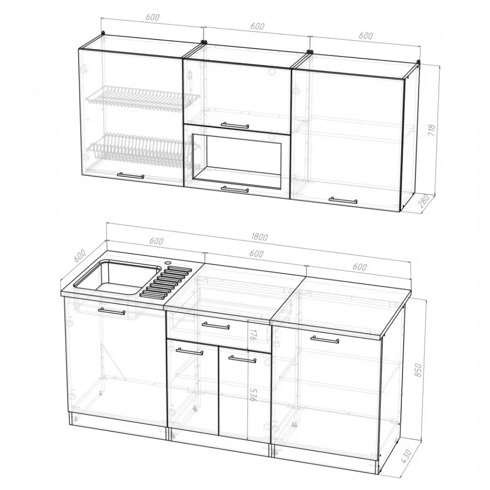 Мойки, смесители и посудосушители в комплекты гарнитуров не входят.