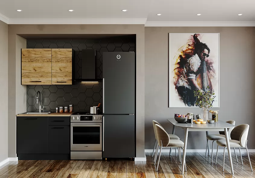 - Столешницы цельные со скруглением по переднему краю, пластиковым покрытием и силиконовый каплесборник (защищает фасады нижних модулей от попадания влаги и разбухания);
