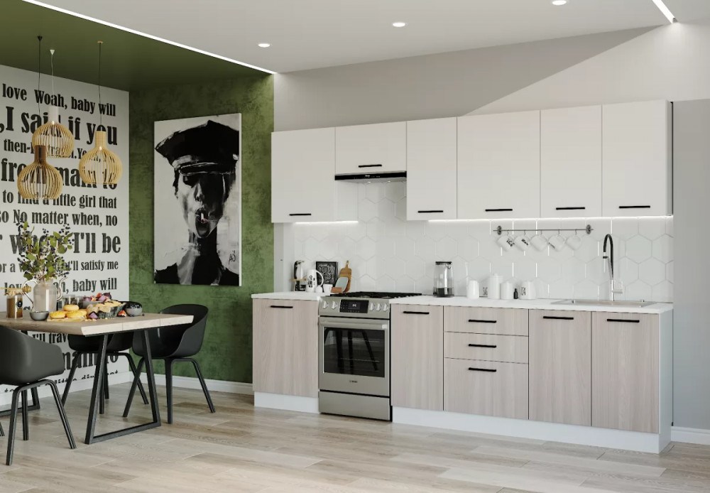 - Столешницы цельные со скруглением по переднему краю, пластиковым покрытием и силиконовый каплесборник (защищает фасады нижних модулей от попадания влаги и разбухания);