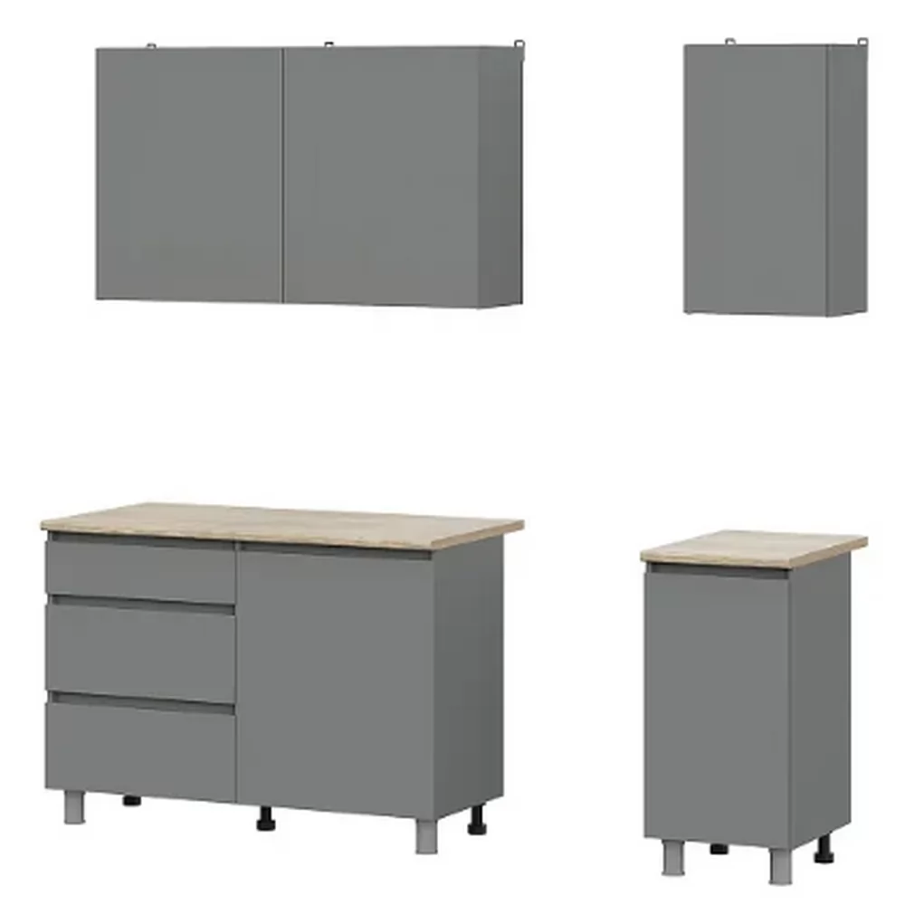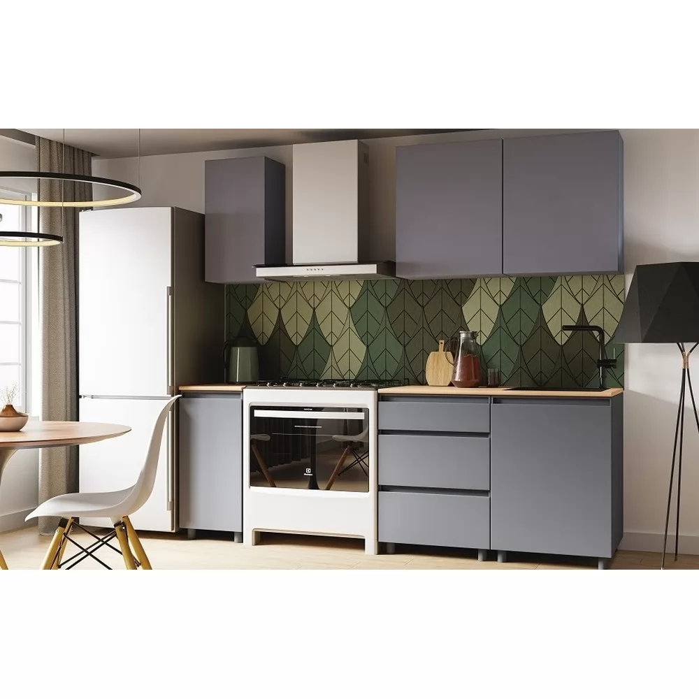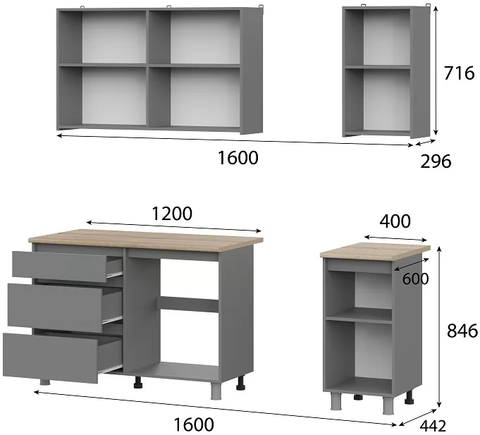 Размер (ШхГхВ): 1600х2140х600 мм;Материалы:корпус - ЛДСП,столешница - ДСП постформинг,опоры - пластик.Цвет: графит серый/тростник.Стиль: современный.Особенности Готовой кухни Денвер:Кухонный гарнитур Денвер шириной 160 см состоит из 6-ти шкафов.Два верхних шкафа шириной 60 см оснащены распашными фасадами.Шкаф шириной 40 см оснащен полкой.Нижний ряд состоит из модуля под мойку, модуля с выкатными ящиками и глухого шкафа.Ящики на роликовых направляющих.Пластиковые регулируемые опоры 10 см.Столешница представлена двумя кусками 120 и 40 см.Под врезную мойку.Объем: 0,209 м3.Вес: 110 кг.Количество упаковок: 5.