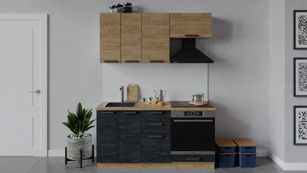 Кухонный гарнитур «Детройт» длиной 160 см со шкафом НБ Дуб крафт золотой/Дуб Крафт золотой/Угольный камень в Тюмени