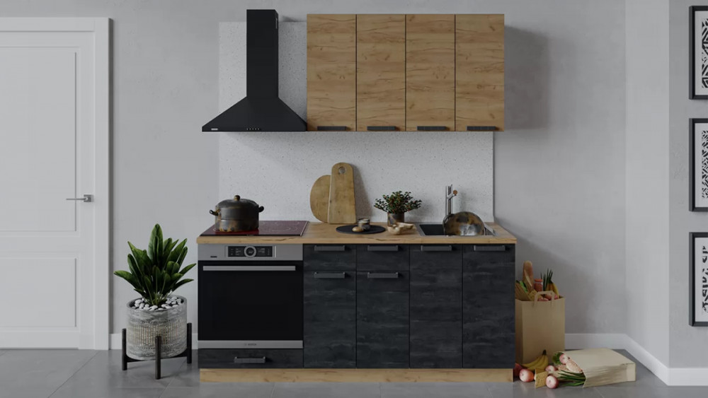 Кухонный гарнитур «Детройт» длиной 180 см со шкафом НБ Дуб крафт золотой/Дуб Крафт золотой/Угольный камень в Тюмени