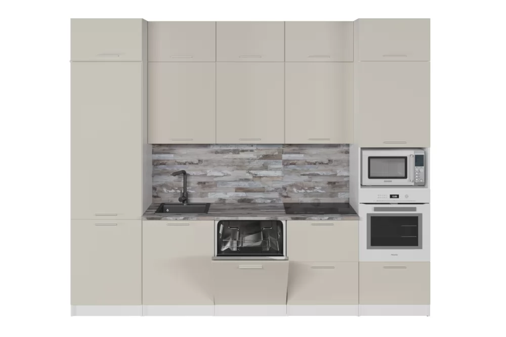 Мойки, смесители, посудосушители, варочные панели, духовые шкафы, плиты, вытяжки в комплекты гарнитуров не входят.