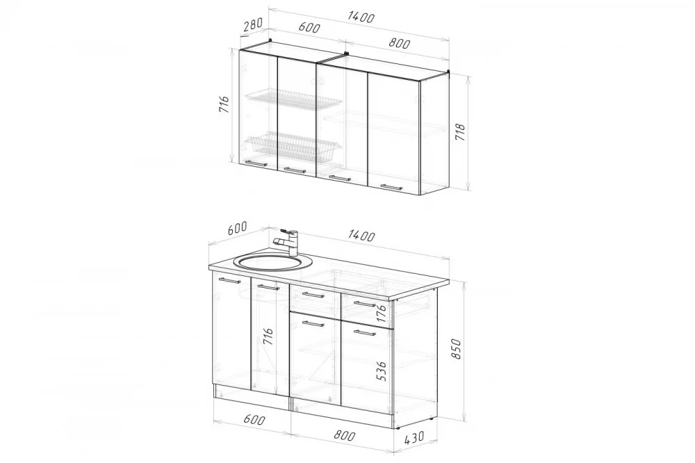 Мойки, смесители и посудосушители в комплекты гарнитуров не входят.