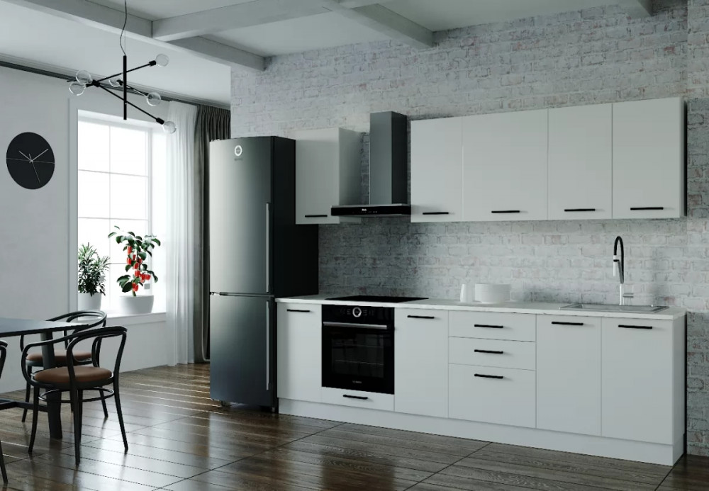 - Столешницы цельные со скруглением по переднему краю, пластиковым покрытием и силиконовый каплесборник (защищает фасады нижних модулей от попадания влаги и разбухания);