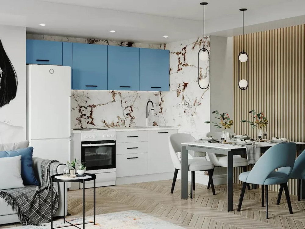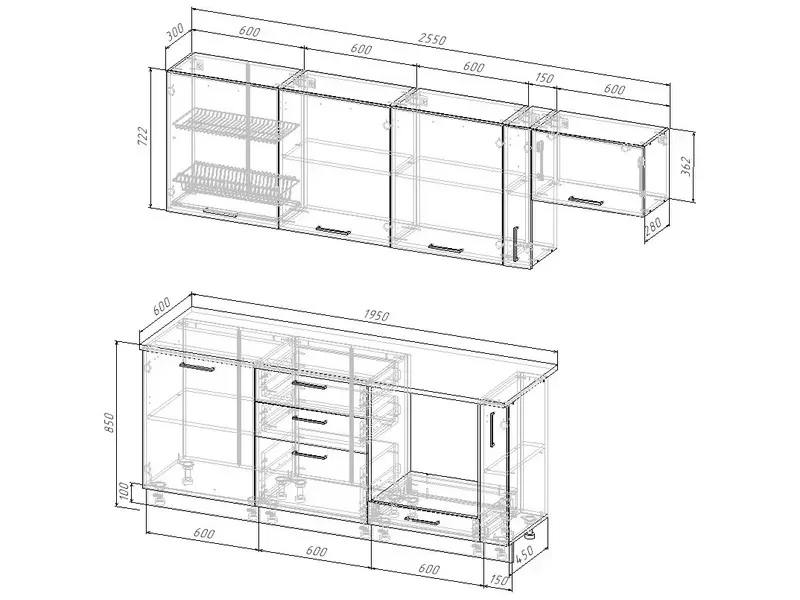 - Фасады верхних модулей со свесом – дают возможность использовать модули без установки ручек, а также установить скрытую подсветку;