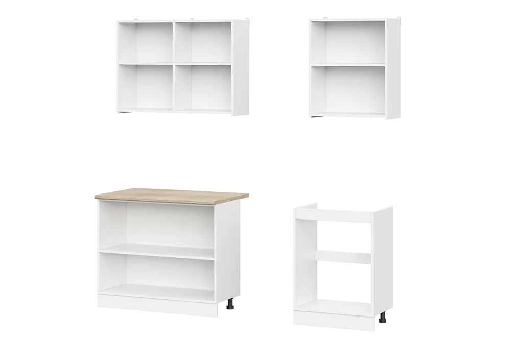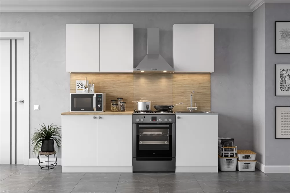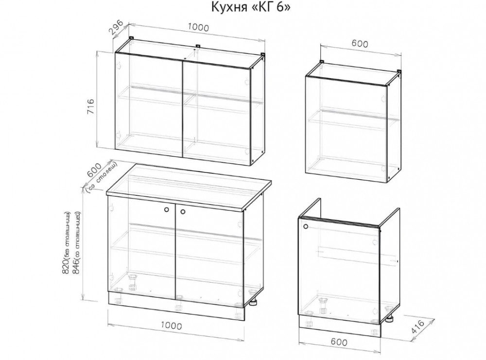 Кухня «КГ 6» — это готовый кухонный гарнитур 1600 мм, который собирается зеркально на любую сторону. Столешница «Тростник» идёт в комплекте. Ручки на верхних модулях не предусмотрены, а открывание происходит за выступающий снизу фасад.