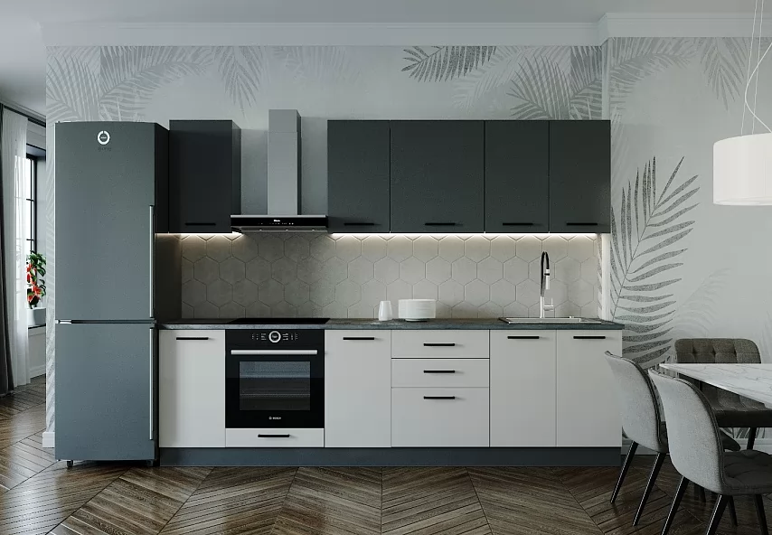 - Столешницы цельные со скруглением по переднему краю, пластиковым покрытием и силиконовый каплесборник (защищает фасады нижних модулей от попадания влаги и разбухания);