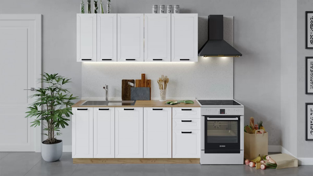 В стоимость не включено: Стеновая панель, столешница, доводчики, бытовая техника, мойка, смеситель, аксессуары