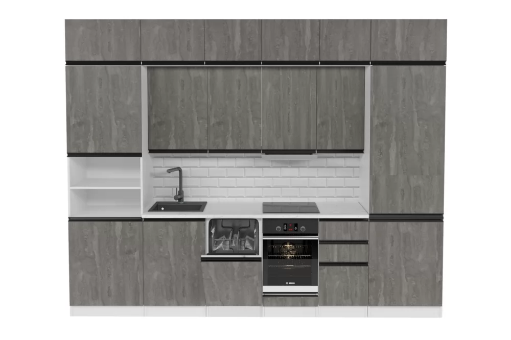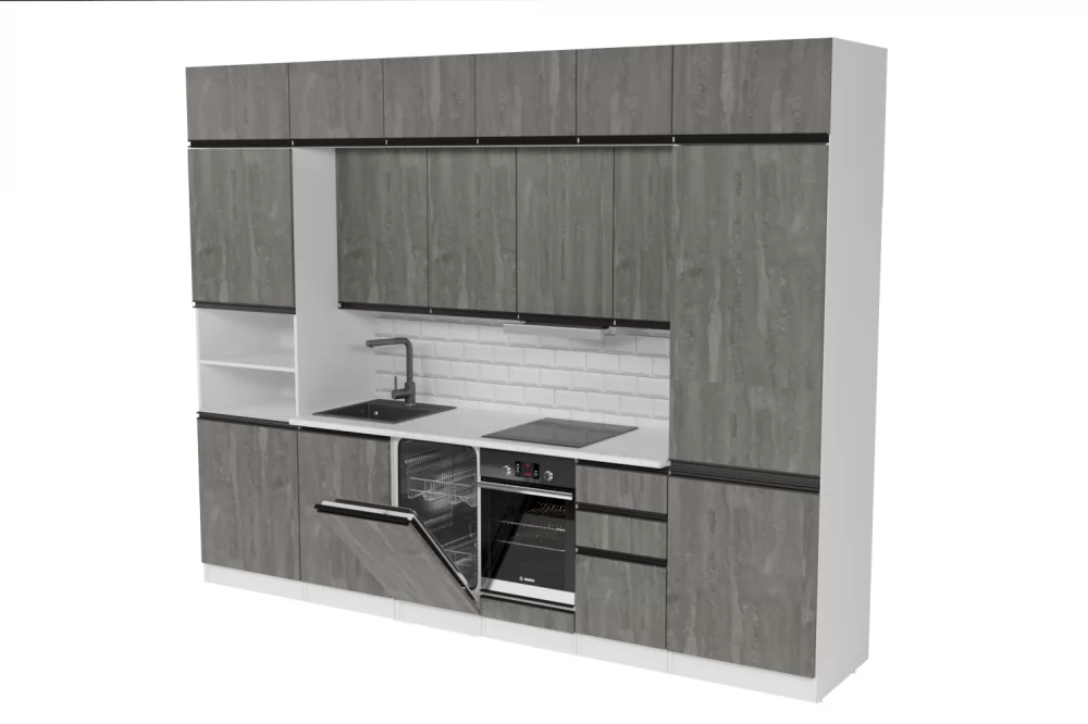 Кухонный гарнитур Ноктюрн из ЛДСП в модном цвете "Бетон тёмный" впишется в современный дизайн интерьера. Подойдет как для частного дома, так и для небольшой квартиры. Напольные и подвесные шкафы позволят разместить всю кухонную утварь. Гарнитур состоит из набора шкафов, которые органично комбинируются между собой. Ящики, полки, навесные шкафы, тумбы и пеналы можно менять местами, создавая практичное рабочее пространство.