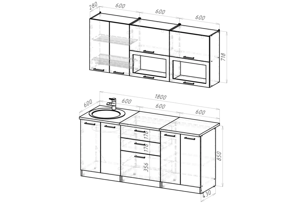 Мойки, смесители и посудосушители в комплекты гарнитуров не входят.