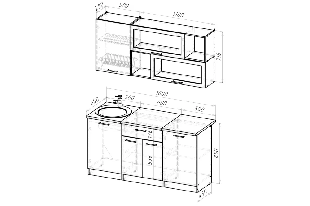 Мойки, смесители и посудосушители в комплекты гарнитуров не входят.