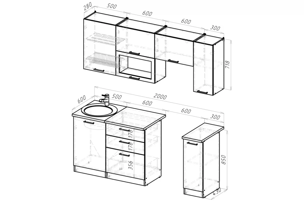 Мойки, смесители и посудосушители в комплекты гарнитуров не входят.
