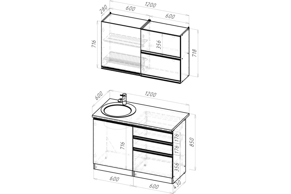 Мойки, смесители и посудосушители в комплекты гарнитуров не входят.