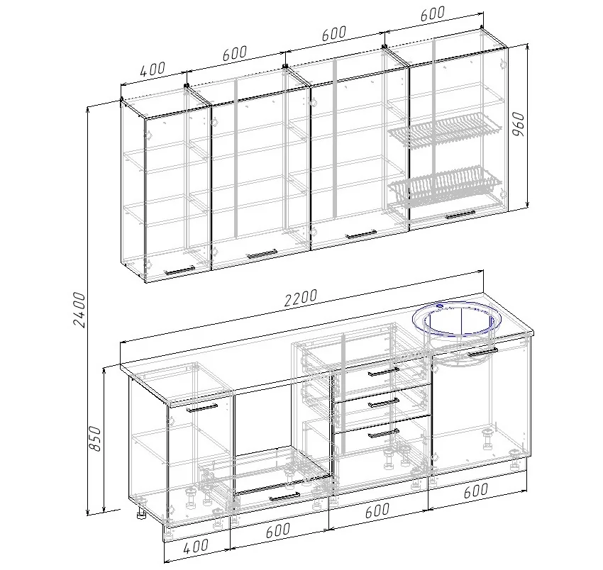 - Фасады верхних модулей со свесом – дают возможность использовать модули без установки ручек, а также установить скрытую подсветку;