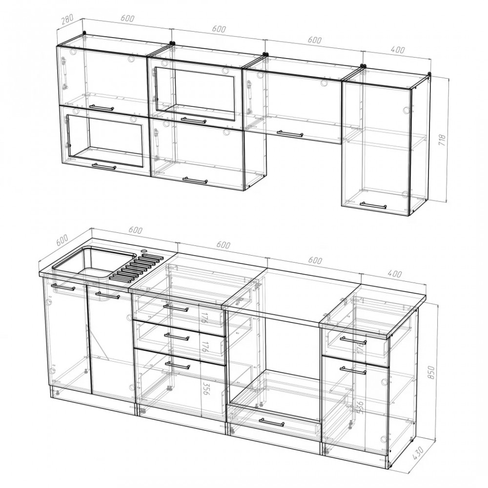 Мойки, смесители и посудосушители в комплекты гарнитуров не входят.