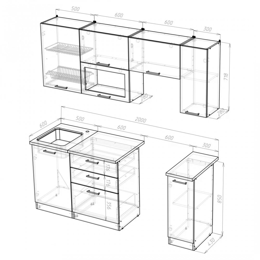Мойки, смесители и посудосушители в комплекты гарнитуров не входят.