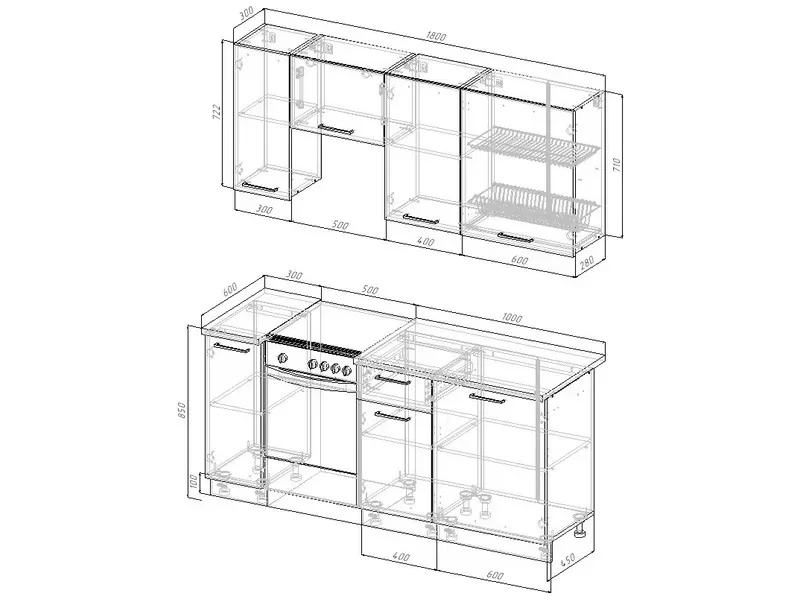 - Фасады верхних модулей со свесом – дают возможность использовать модули без установки ручек, а также установить скрытую подсветку;