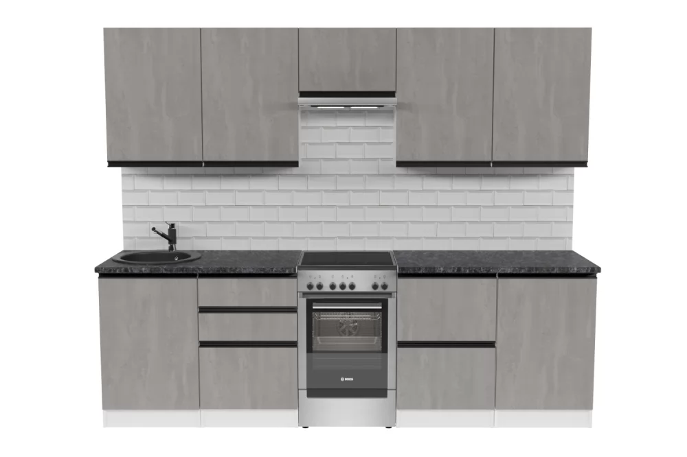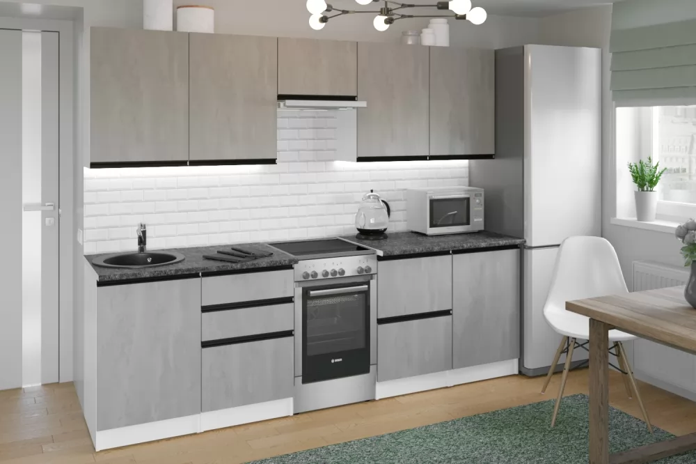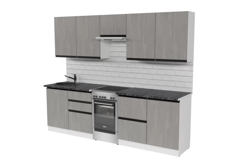 Кухонный гарнитур Сюита из ЛДСП в модном цвете "Бетон светлый" впишется в современный дизайн интерьера. Подойдет как для частного дома, так и для небольшой квартиры. Напольные и подвесные шкафы позволят разместить всю кухонную утварь. Гарнитур состоит из набора шкафов, которые органично комбинируются между собой. Ящики, полки, навесные шкафы, тумбы и пеналы можно менять местами, создавая практичное рабочее пространство.