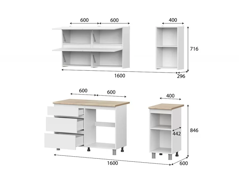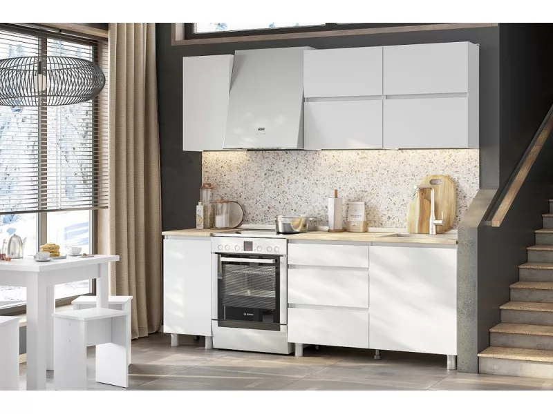 Кухонный гарнитур "Токио" 1600 мм отлично впишется в большинство современных интерьеров. Фасады шкафов не имеют ручек, вязки верхних шкафов подняты выше края боковин, что дает возможность создать зацеп для открывания створки. Фасады стола имеют скос 45 градусов, для более удобного открывания.
