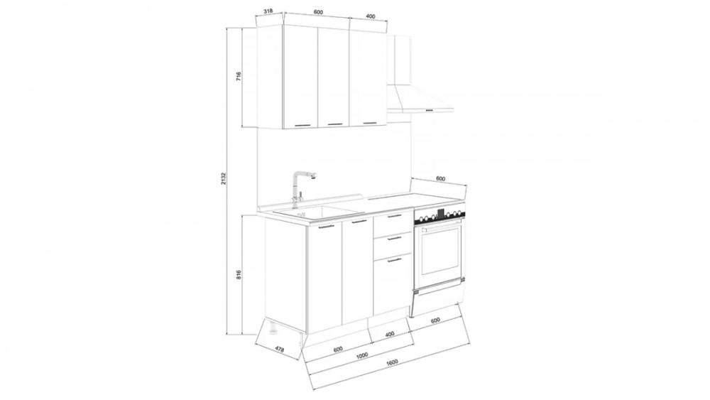 Габаритный размер готового набора модулей с учетом газовой плиты на 60 см: 1 600