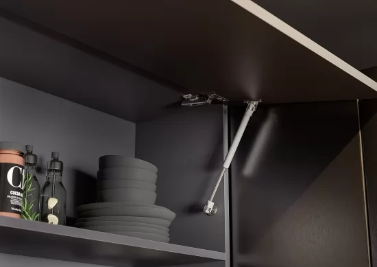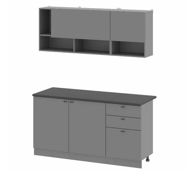 Кухонный гарнитур Энни 1,6 покрыт цельной черной столешницей толщиной 26 мм. В случае, если возникает необходимость между столами и верхними шкафами разместить бытовую технику, необходимо распилить столешницу на длину 500 мм и 1100 мм, закрыв открытые спилы торцевыми планками для 26-ой столешницы. Кухонные столы устанавливаются на регулируемые пластиковые опоры с клипсами для цоколя. Комплектация каждого стола подразумевает наличие цоколя-партнера длиной, равной длине стола.
