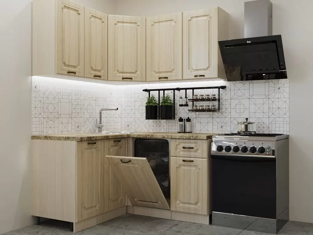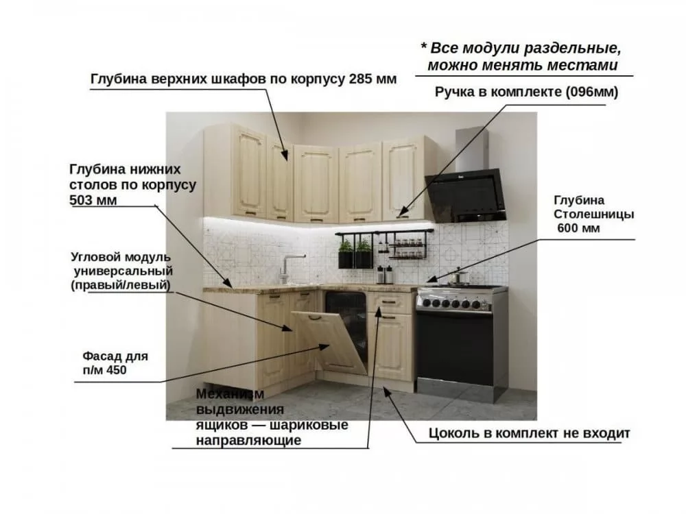 Кухонная мойка, стеновая панель, посудосушитель, цоколь, планки для столешницы в комплект не входят.