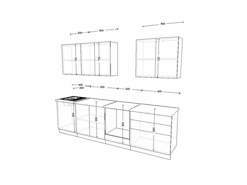 Кухонная мойка, стеновая панель, посудосушитель,цоколь, планки для столешницы в комплект не входят.