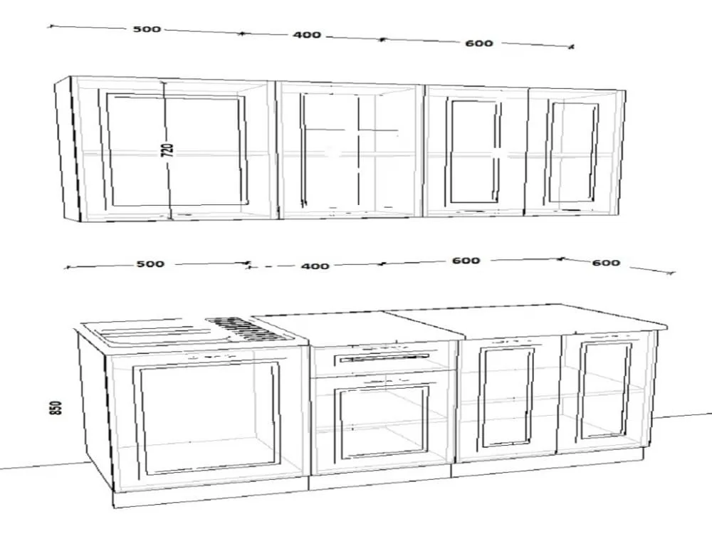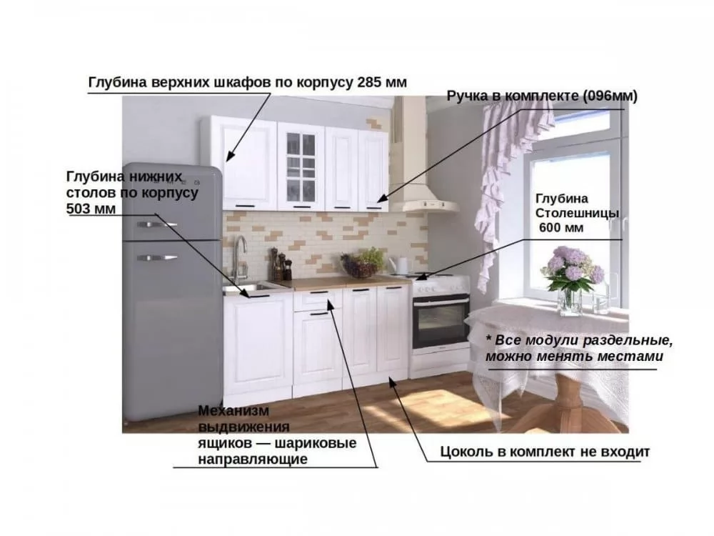 Кухонная мойка, стеновая панель, посудосушитель, цоколь, планки для столешницы в комплект не входят.