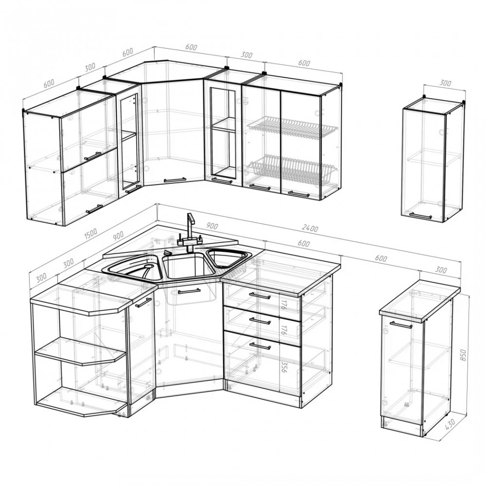Мойки, смесители и посудосушители в комплекты гарнитуров не входят.