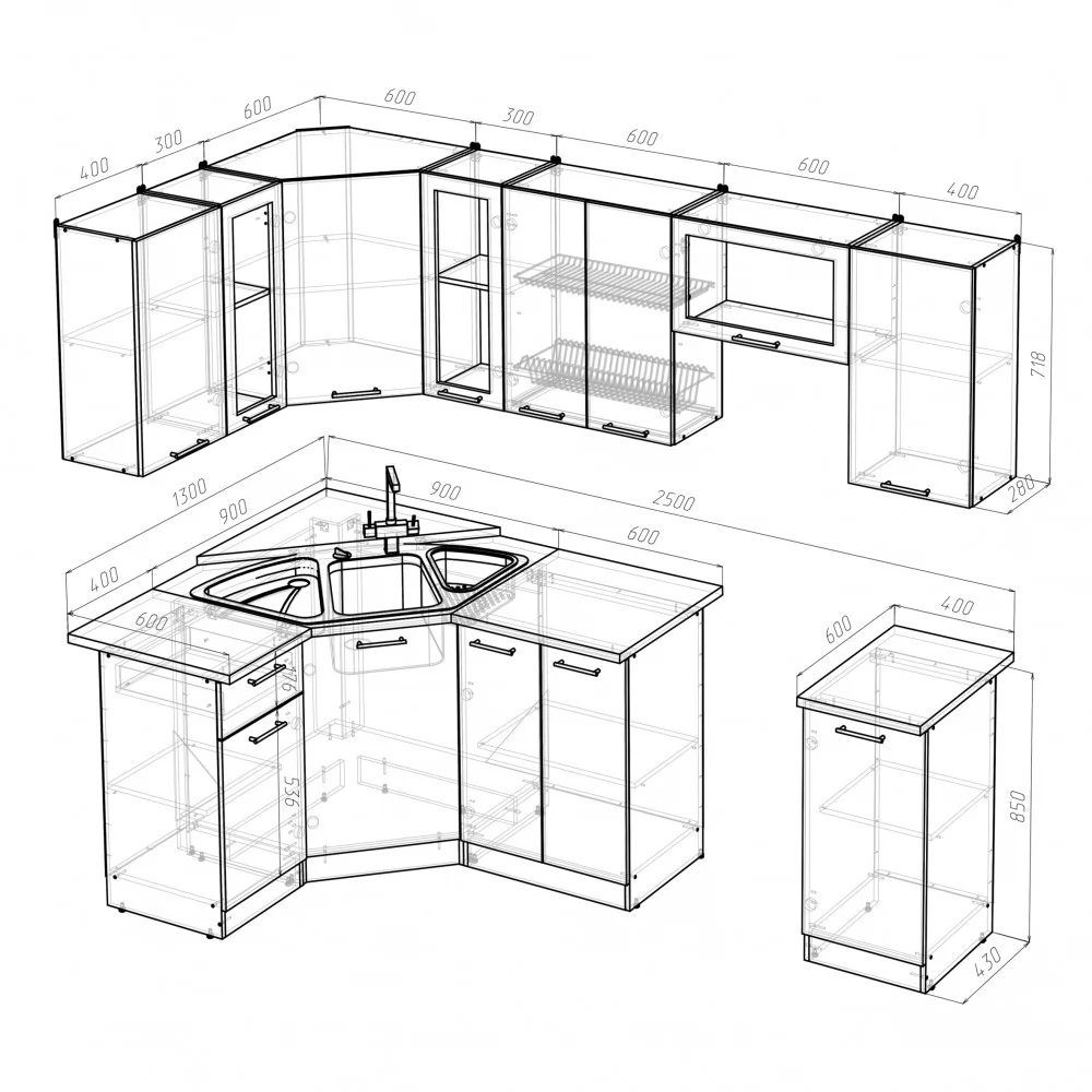 Мойки, смесители и посудосушители в комплекты гарнитуров не входят.