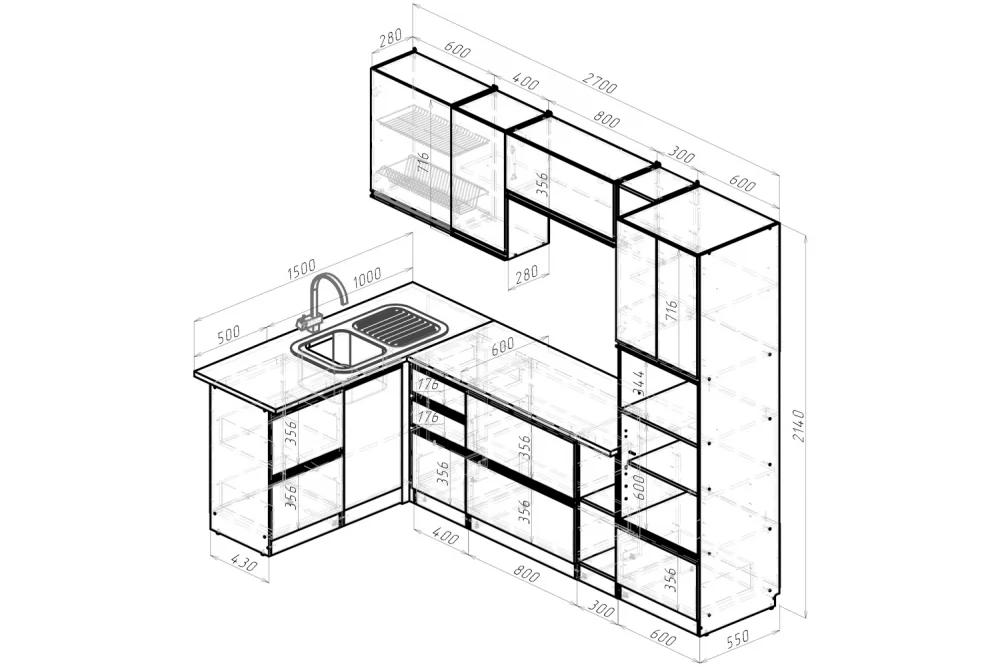 Мойки, смесители и посудосушители в комплекты гарнитуров не входят.