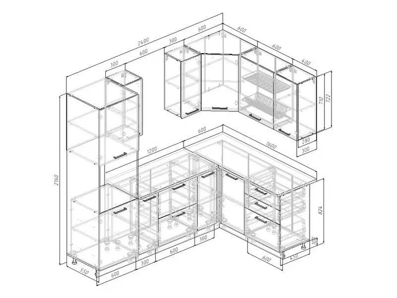- Фасады верхних модулей со свесом – дают возможность использовать модули без установки ручек, а также установить скрытую подсветку;