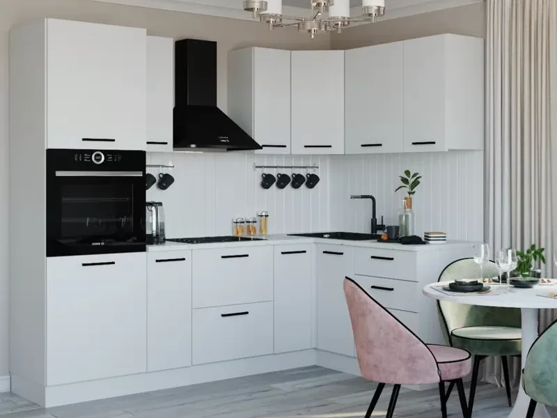 - Столешницы цельные со скруглением по переднему краю, пластиковым покрытием и силиконовый каплесборник (защищает фасады нижних модулей от попадания влаги и разбухания);