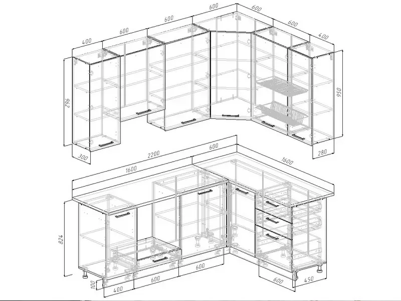 - Фасады верхних модулей со свесом – дают возможность использовать модули без установки ручек, а также установить скрытую подсветку;