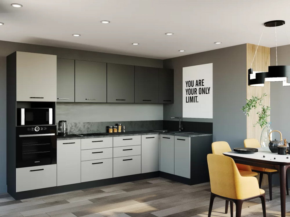 - Столешницы цельные со скруглением по переднему краю, пластиковым покрытием и силиконовый каплесборник (защищает фасады нижних модулей от попадания влаги и разбухания);