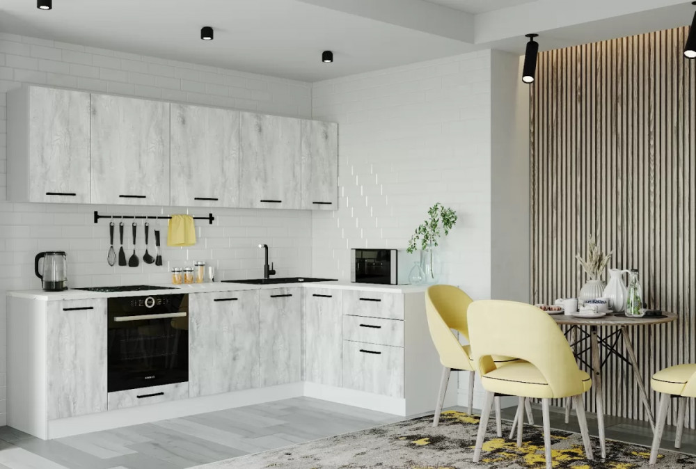 - Столешницы цельные со скруглением по переднему краю, пластиковым покрытием и силиконовый каплесборник (защищает фасады нижних модулей от попадания влаги и разбухания);