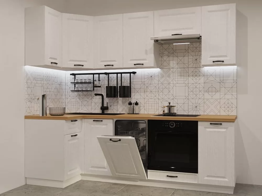 Кухонная мойка, стеновая панель, посудосушитель, цоколь, планки для столешницы в комплект не входят.
