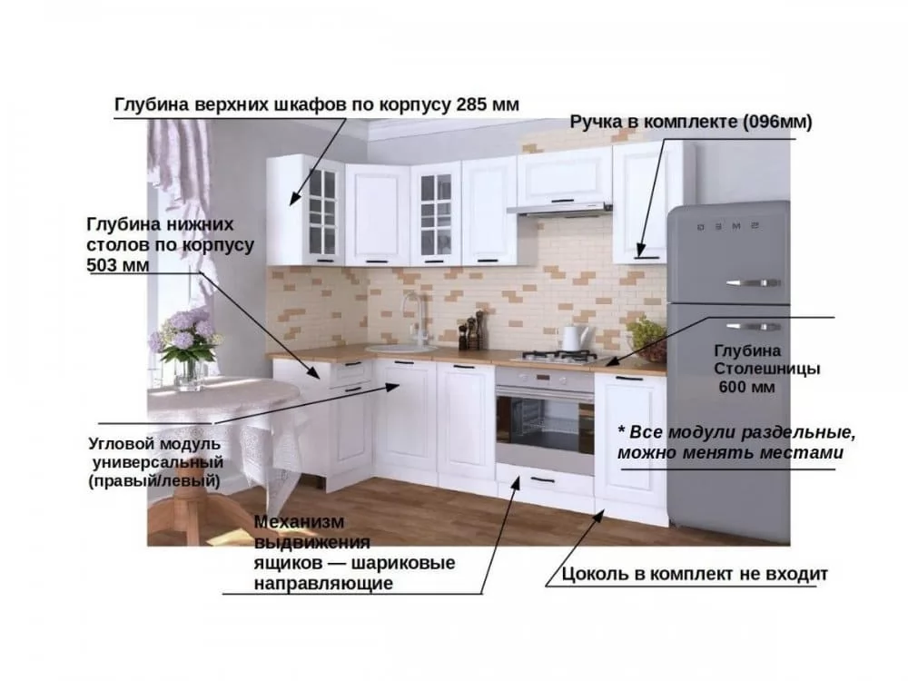 Кухонная мойка, стеновая панель, посудосушитель, цоколь, планки для столешницы в комплект не входят.