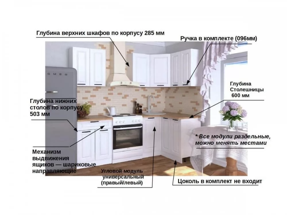 Кухонная мойка, стеновая панель, посудосушитель, цоколь, планки для столешницы в комплект не входят.